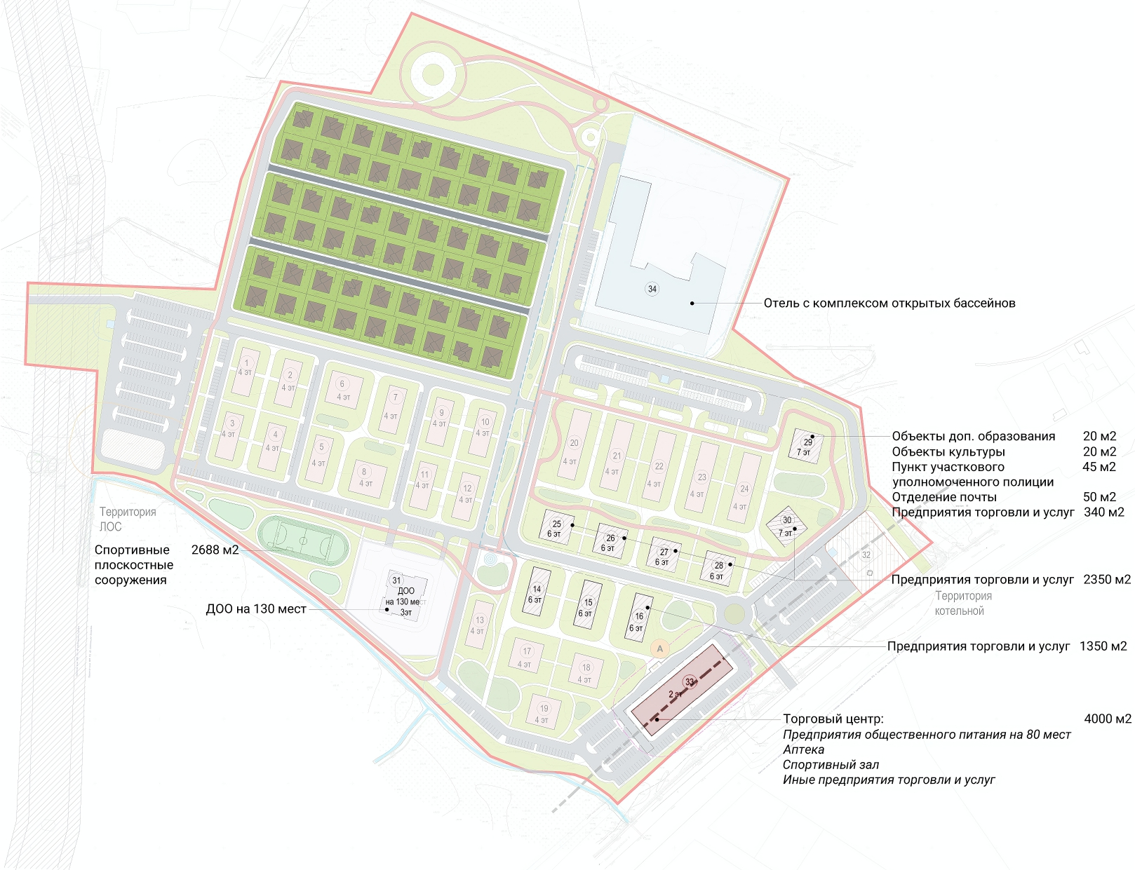 В составе территории запроектированы детский сад, парковое пространство, физкультурно-оздоровительный комплекс с бассейном и семейным отелем, ресторан, кафе, торговый центр, малоэтажные многоквартирные дома.